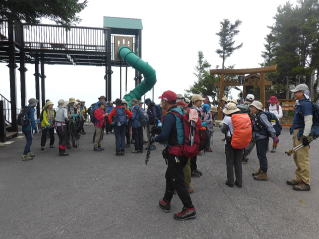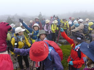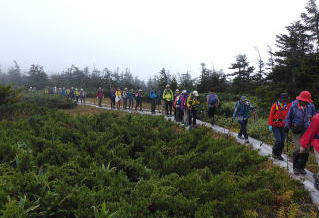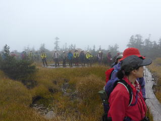 森に囲まれた山頂を10分も下ると途中から木道とまた池塘のある湿原地帯に出会う。そこから来たときと別ルートで天狗岩にある吾妻神社奥の院へ向い、そこで集合写真を撮り、来たコースを戻り北望台へ15:30到着。