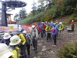 ロープウェイ天元台高原に到着後、歩いてリフト1基目からザックを前にして2人ずつ乗車する。時々止まったりゆっくりになったりしていたので、リフトの管理の方が乗り降りに配慮していることが分かった。