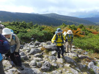 大凹を過ぎると灌木帯の短い登りになるが、ここからは大きな岩が続いており登りにくいし時間がかかる登山道になる。少しゆっくりと登り、登り終えると再び湿原が広がり、奥へ進んで行くとまた大きな岩が重なる梵天岩に12:37到着。皆に梵天岩をよじ登ってもらい、今まで来た縦走路や広大な吾妻連峰、湿原を一望してもらう予定であったが、少しガスっていたのと予定時間が過ぎていたので、スルーした。