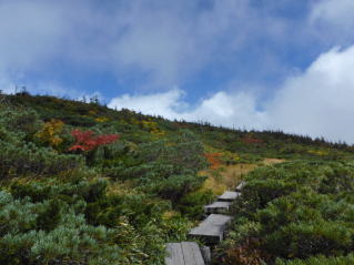 人形石に向かう木道と湿原地帯の大凹、西吾妻山の梵天岩方面の分岐に差し掛かる。木道では、草木が色づき始めていたし、湿原地帯の大凹の池塘周りの草紅葉は盛りであった。