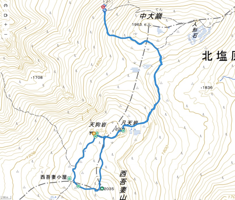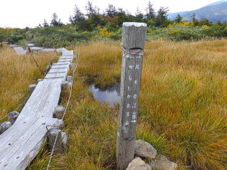 昼食後、木道の場所は良いが、低い灌木の道はいつものように水がたまり汚泥のような場所が多い登山道を歩き、針葉樹の森をゆるやかに登って行けば20分で吾妻連峰最高峰の西吾妻山(2035m)の山頂に13:30到着。
