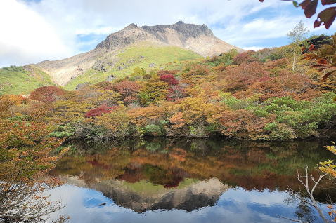 姥ヶ平まで降り振り返ると紅葉の向こうに茶臼岳が、そしてその先のひょうたん池からはもっと素晴らしい「逆さ茶臼」を望む事が出来た。