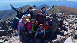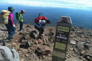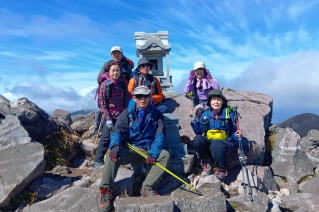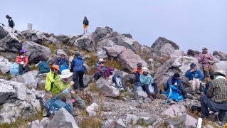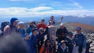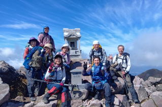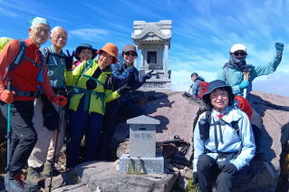 山頂の御社の前で集合写真(班別)、そして山頂の標柱の前で男女別の集合写真に収まった。