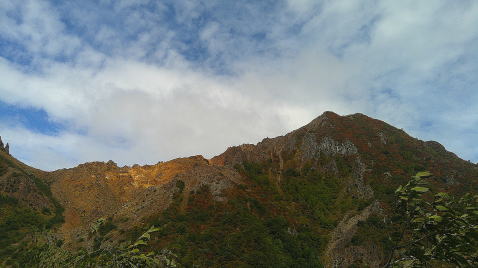 茶臼の中腹を回る登山道からは眼下に紅葉が美しい姥ヶ平が観えてくる。