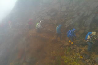 問題は朝日岳からの下山路、急こう配のガレ場、狭いヘツリ(落ちたら命は無い)、そして強風と雨。