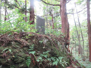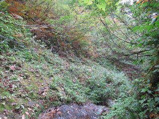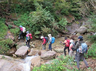 1時間半で遭難碑のある「お京平」に到着して小休止、その先の渡渉と七曲りを過ぎると又々ヌルヌル岩のヘツリ道「ひるわ覗き」です。