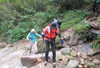 最初の渡渉と急崖は小手調べ、先へ進むとヌルヌル岩のヘツリ道が続きますが“特殊滑り止めアイテム”のお陰で何とかクリア。