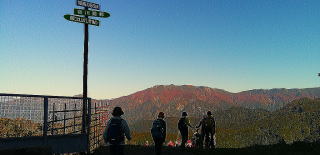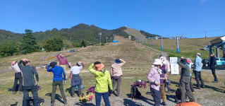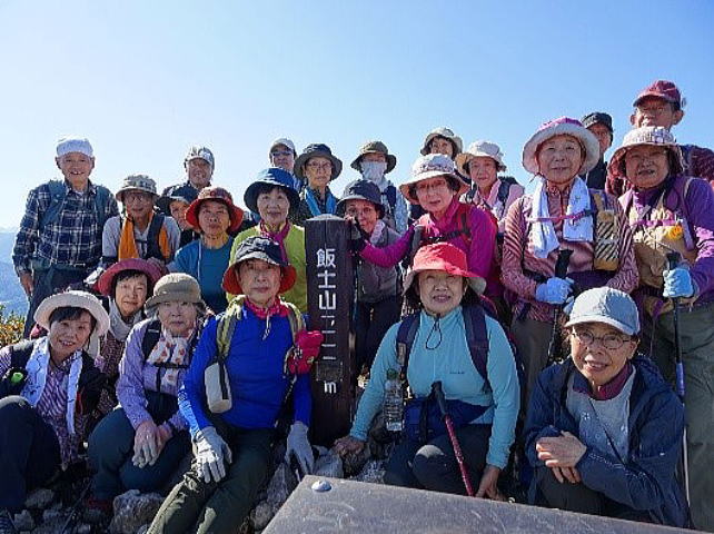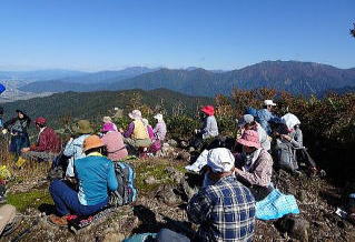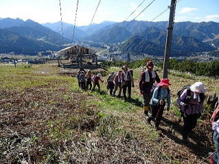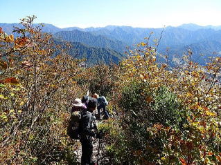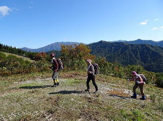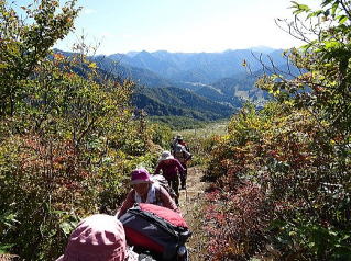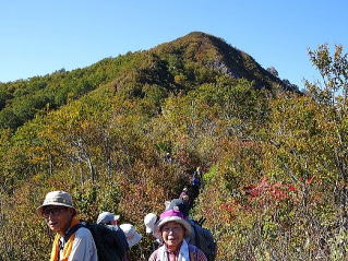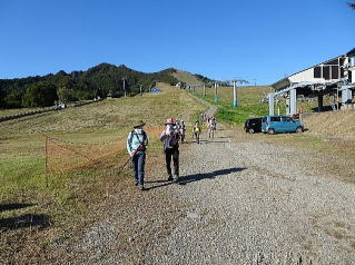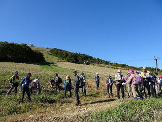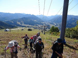 岩原スキー場駐車場で登山の準備をし、南コース登山口のあるリフト終着に向け出発。リフト下の直登は楽ではありませんが、休憩時に振り返ると谷川連峰が、東には巻機山が秋晴れに映えて、皆さん感激していました。