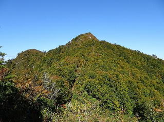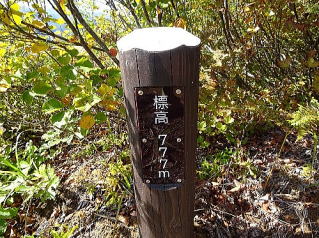 標高777mの標柱が立つ南コース登山口からは次第に急登になります。標高888m過ぎで一息入れ、標柱999mを過ぎると急登も終わりになります。ホット一息つき見上げると山頂が現れます。登山道わきの木々も色づいていました。