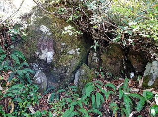 山頂北側の平地に移動し、巻機山や魚沼三山、眼下の塩沢町を眺めながら昼食を楽しみました。すぐそばに石仏が佇んでおり、山名の由来にある食物の神仏が祀られているのかなと思いました。