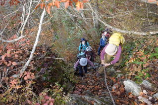しかし、天狗岩を過ぎると道の勾配もきつくなり足元も悪くなって来ます。紅葉や石仏が励ましてくれるのですが…。 |