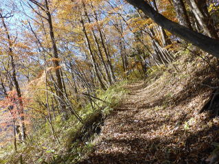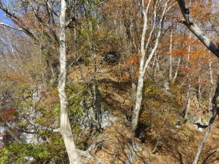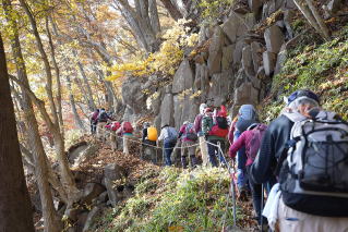 紅葉が映える六合目/炮碌岩の狭い登山道を歩く