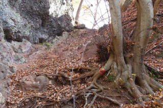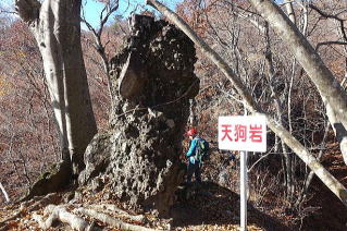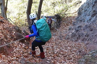 奇岩の天狗岩を見て、6合目の赤岩通りの分岐に着きました。ここからは、今上った分を、一旦下ります。長い鎖場があり、足元は落ち葉で下に何があるか分からないので、慎重に降りました。
