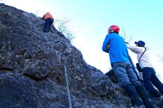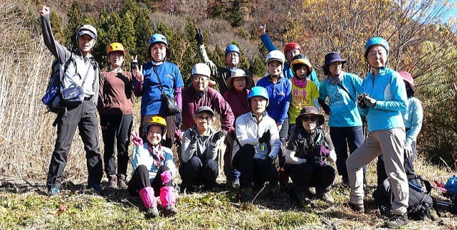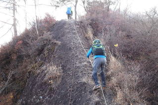 いよいよ、頂上直下の鎖場です。頂上は狭いので、班ごとに交代で登ります。リュックをデポして身軽になり、1人ずつ鎖を握り慎重に登りました。 頂上では、各自の思い思いのポーズで記念写真をとり、360度の大展望を楽しみました。