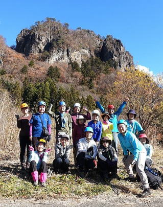 | 11:10蜜岩登山口手前での集合写真、バックに岩櫃山が聳えていました |