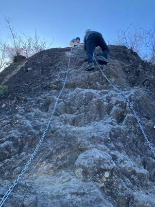 岩場の急登、梯子、チェ-ンを慎重に登る。いつしか熊のことは忘れて山頂直下に着いた。本日のメインを一人一人チェーンを掴み山頂へ。