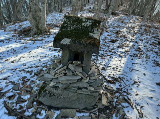 下山女坂を10分程下ると祠が中央に鎮座。北側で日が当たらず雪が残り落葉と重なり滑りやすく途中で軽アイゼン装着。落葉が歯に食い込むも滑りは止まる。軽快?足を少し上げ気味に慎重に下る。急登を下りるとアイゼンを外し…最後はフカフカ杉林の道。林道にあった氷華の姿は消えて、早朝のいっときの瞬間に立ち会えて良い思い出となりました。