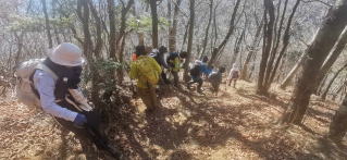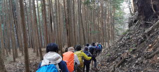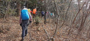 帰りは同じ道を少し下って杉山新道を降りる。道には落ち葉がいっぱい。その落ち葉が積もって柔らかくなった登山道。急斜面をジグザグに降りると住宅地に出る。落合水路橋という水路の下をくぐって県道に出る。ここに旧道の交差点があり中型バスの出入りができる、事前の計画ではここから30分歩いて道の駅まで行く予定だったが、そこにバスに乗るようにしたので30分の節約ができた。そこからコンビニ、そしてトイレ休憩をとり宿に入ったのでした。