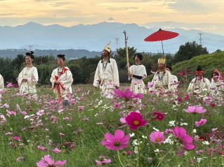 午後の部は、この祭りのハイライトである「王の儀式」から始まりました。コスモスの絨毯が広がる中、太鼓の音が響き渡ると、二子山古墳の頂から古代の衣装をまとった王様の隊列がゆっくりと下りてきます。その威厳ある姿は、まさに時代絵巻そのもの。