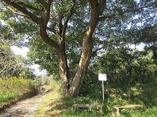 更に進み越前浜へ続く道を左に分けると、「気になる木」の前に出ます。「気になる木」の1本は樹高13m、幹周2.2mの大エノキで令和元年に新潟市に保存樹として登録されています。2本の大エノキが立つ小広場にはベンチがあって良い休場になっています。この辺りが赤塚砂丘の最高地点、清三郎山の南の肩にあたります。