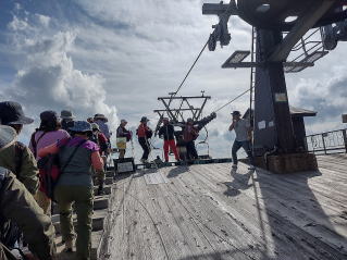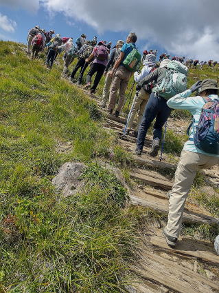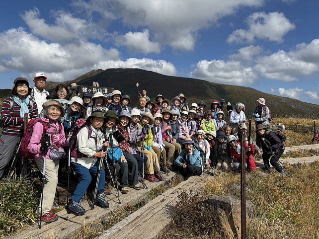 きょうは、最高の登山日和です。50人の大行列、他の登山者に迷惑とならないよう、みんなで「登山者が行きまーす。右側(又は左側)に寄ってー」と大きな声を出しました。