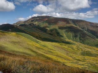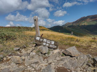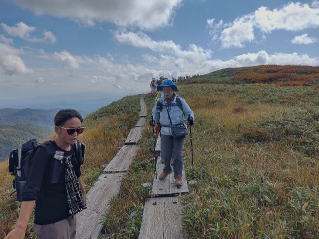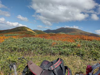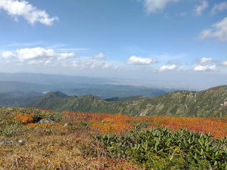 頂上の看板の前で集合写真を撮り、草紅葉の見える所へ下り、又戻り、山頂駅を目指して下山しました。紅葉している月山、遠くに山並み、月山湖(ダム湖)と寒河江川が見えました。途中、赤ちゃんと2人の子供を連れた若い夫婦や若者等、軽く会話を交わせた事は山登りならではの楽しいひと時でした。 |