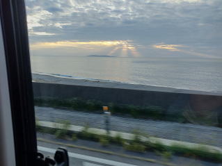 村上で、雲の中から光の筋が粟島を照らしている幻想的な風景をバスの中から見ることができました。