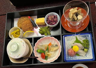 今日の昼食は割烹「新喜屋」さんのこだわりランチ。お店からの特別サービスの乾杯酒(おふくさん)付き。しょうゆ赤飯や煮菜など長岡の郷土料理が並び、発酵・醸造の街らしい大満足の献立だった。