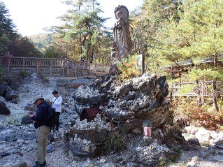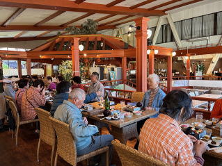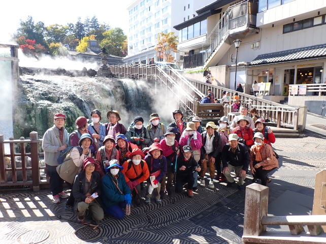 素晴らしい好天に恵まれての出発、途中、道の駅中山盆地で高原野菜を皆さん沢山買いました。八ッ場ダムを眺め、紅葉の始まった草津路をたどり、草津ホテルビレッジに到着。少しは早めの美味しい昼食を取りました。