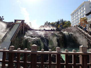 日本一と言われる草津のシンボル湯畑、7本の湯桶から流れ落ちる湯の量と熱気がすごい!!を撮りました。