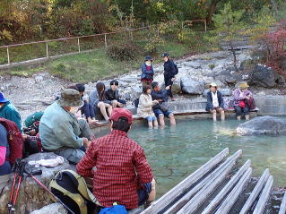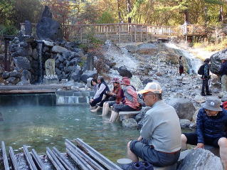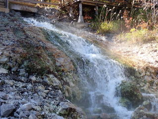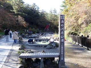 西の河原公園へ。西の河原は至るところから温泉が湧き出し、大量の湯煙を上げ湯川となって流れています。その為、どこを歩いてもほんのりと温かい。連なる朱い鳥居をくぐり、40段の階段を登り稲荷神社に参拝。ご利益があるかな?その後、思い思い足湯でリラックス。