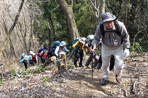 搦手道入口から黒滝城址まで、標高差で200m程の急登が続きます。時間にしたら30分ほどの登りですが、途中から沢沿いの泥んこの急登で、昨年この登りを、“とどめを刺されたような登り”と評した会友がいましたが、まさにその通りです。10時間歩いた後の泥んこの急登は、心身に応えました。 |