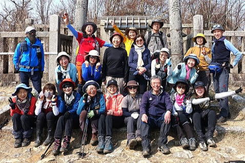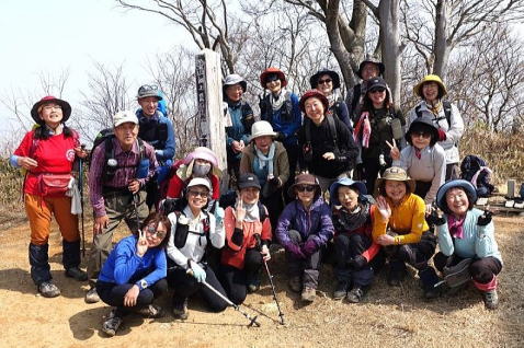 カタクリを堪能した後、最後の国上山に向かいます。17:05、ようやく国上山山頂に到着、ここまで12時間と15分、頑張って歩きました。とても疲れましたが、皆さん笑顔で、歩き通した満足感もいっぱいです。 |