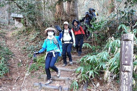 にぎやかだったおしゃべりも、登りがきつくなると静かになります。そんな時は要注意です。12:10、多宝山山頂に到着、30分ほどの短めのお昼です。風も少し有って、体が冷えないように1枚着込みました。お昼の後は、集合写真です。まだまだ、皆さん元気一杯です。