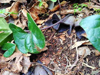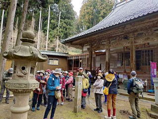 村岡城址で集合写真を撮り東屋で休憩した後、六万部塚を回るとカンアオイや珍しい雪割草を見ることができました。