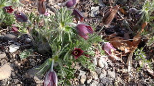下山後のお楽しみオキナグサ(翁草)、花が終わると茎が伸びそれがまるで白髪の様に見え、それが翁草という和名の由来だそうです。 |