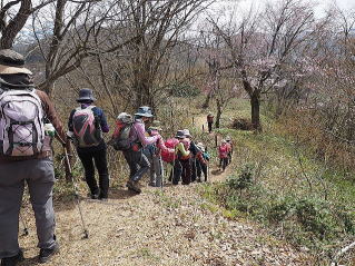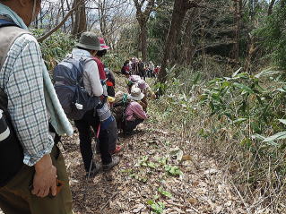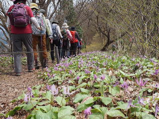 登山口から少し登ると神社があり、みんなで安全登山を願います。そこからもうお花だらけ、すぐにコシノコバイモが現れ、写真タイムでなかなか前へ進みません。カタクリのピンクの絨毯もずっと続きます。