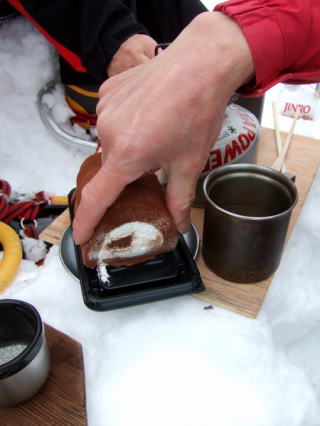 戻りながら眺めの良い快適な場所でお昼です。 今回は太陽も照っていて暖かく風も無くテントを男性陣が担ぎ上げてくれましたが張らずにスコップで雪のテーブルと椅子を作って豪華な雪上ランチでした。