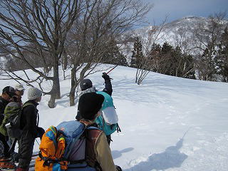 好天を求めて長野まで来た甲斐があったか?晴れ男・玉野の面目躍如か?トレイルクラブのガイドの「この冬一番のコンディション」も、あながちリップサービスとも思われぬ暖かさだ。サングラス必携、夏山と変わらぬスタイルで9:00過ぎ、白銀の山頂を目指す。 |