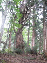 午前中に歩いた山並みを見ながら、ブナや杉の大木の大きな根っこに足をとられないよう慎重にくだっていると、「こんな所で滑ってケガ