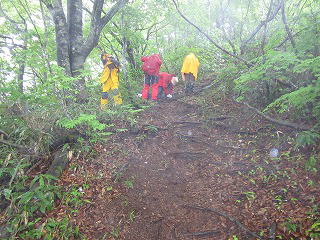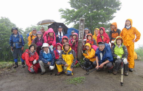 雨の中、山頂での昼食を見合わせ集合写真を撮った後、すぐに下山開始。