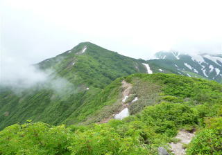 後方より「オーイ、オーイ」の声こちらもやり返す、しばらく待っても姿が見えてこない。構わず進むと大朝日の雄姿が、山頂にはガスがかかっている、間もなく銀玉水、もう一度「オーイ」と後方へ、しばらく待っているとその姿が見えてきた。日本一うまいといわれる銀玉水にて喉をうるおし今晩の水を補給。