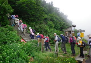 新潟からの4時間弱のバス旅、漸く大平登山口に到着しましたが、濃い霧が覆っています。