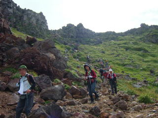 途中で振り替えて見ると頂上はガスの中。少しでも遅れると我々もガスにまかれていたと思う。