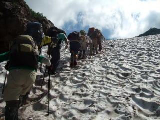 | 雪渓の大部分が解けていました。 | 今頃の雪渓は スプーンカットです。 | 皆で雪渓を頑張って登る、涼しいです | |||||||||||||||