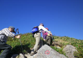 尾根の山陰から御来光が差し込んできました。陽射しの強い快晴の一日が始まろうとしています。急登の疲れも吹き飛びそうです。 |
