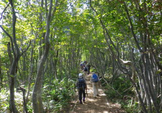 設置を終えた標柱を眺めながら楽しい昼食タイム。しかし時間は未だ10時ちょっと過ぎ、随分早い昼食となった。 早い昼食を終えると、元気一杯の我新潟楽山会メンバーは「五頭山の新しい標柱を観に行こう!!」と意見が一致し五頭山山頂に向かって縦走開始。 予定していない山歩きとなったが、素晴らしい尾根歩きとなった。 |