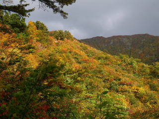 晴れていれば、迫力ある燃えるような大岩壁の紅葉が見られたものの、ちょっぴり残念です。