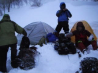 14:00本当はもっと前進したかったのだが幕営ポイントを考えテント設置にはいる。冬山では行動そのものよりもいかに寒さ等から