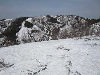 風越山へ向うのは私たちだけでした。稜線は雪解けが進んですっかりヤブが出ています。尾根に沿って雪原の斜面を下っていきました。 |